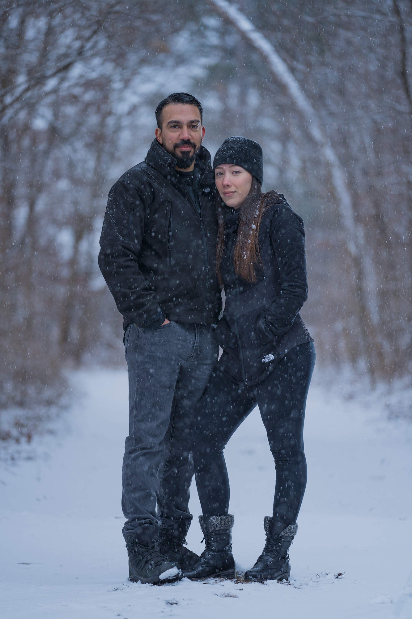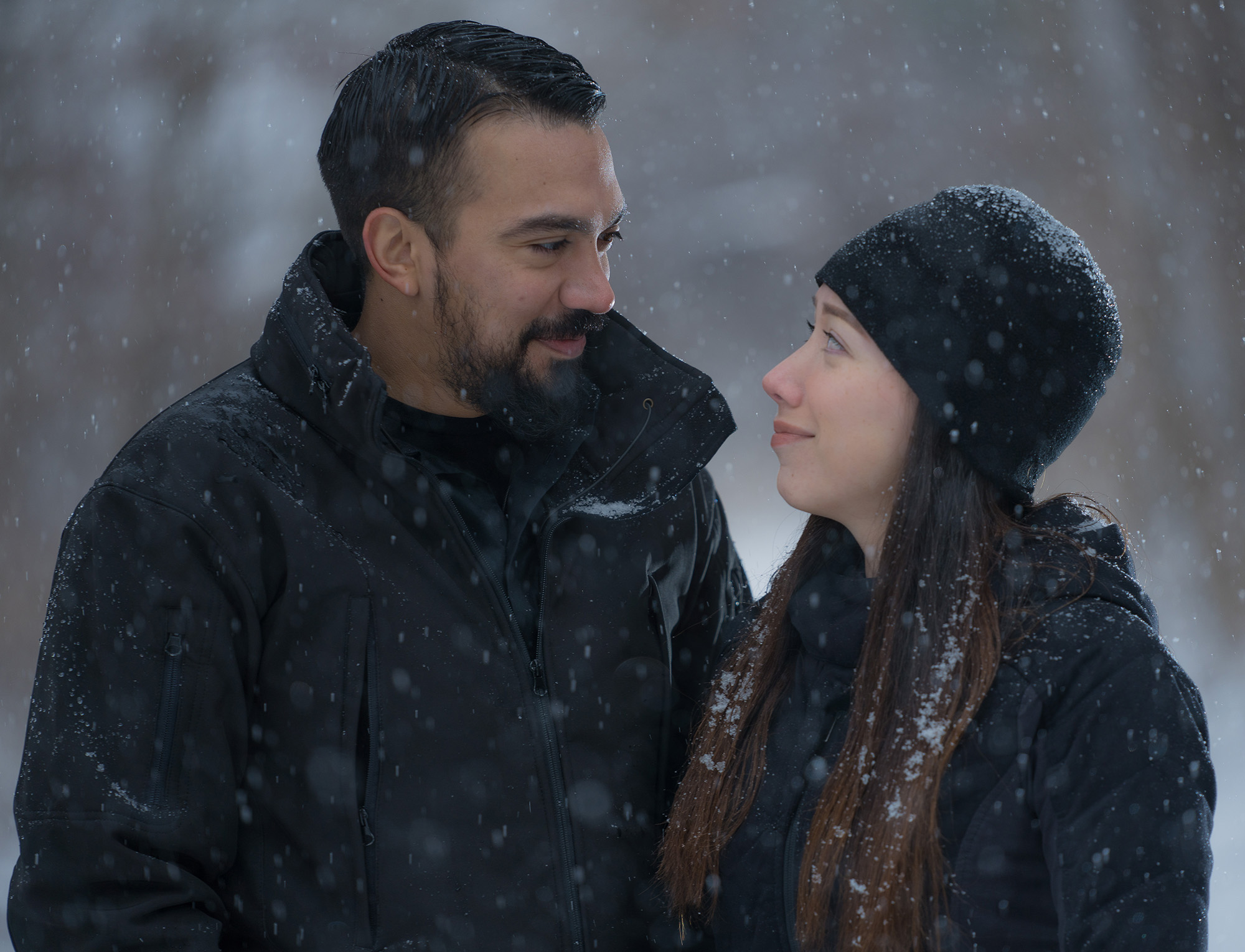 This is a couples portrait during snowfall. Two speedlights and an umbrella were used as key light and backlight. Black attire was chosen to contrast with the snow.