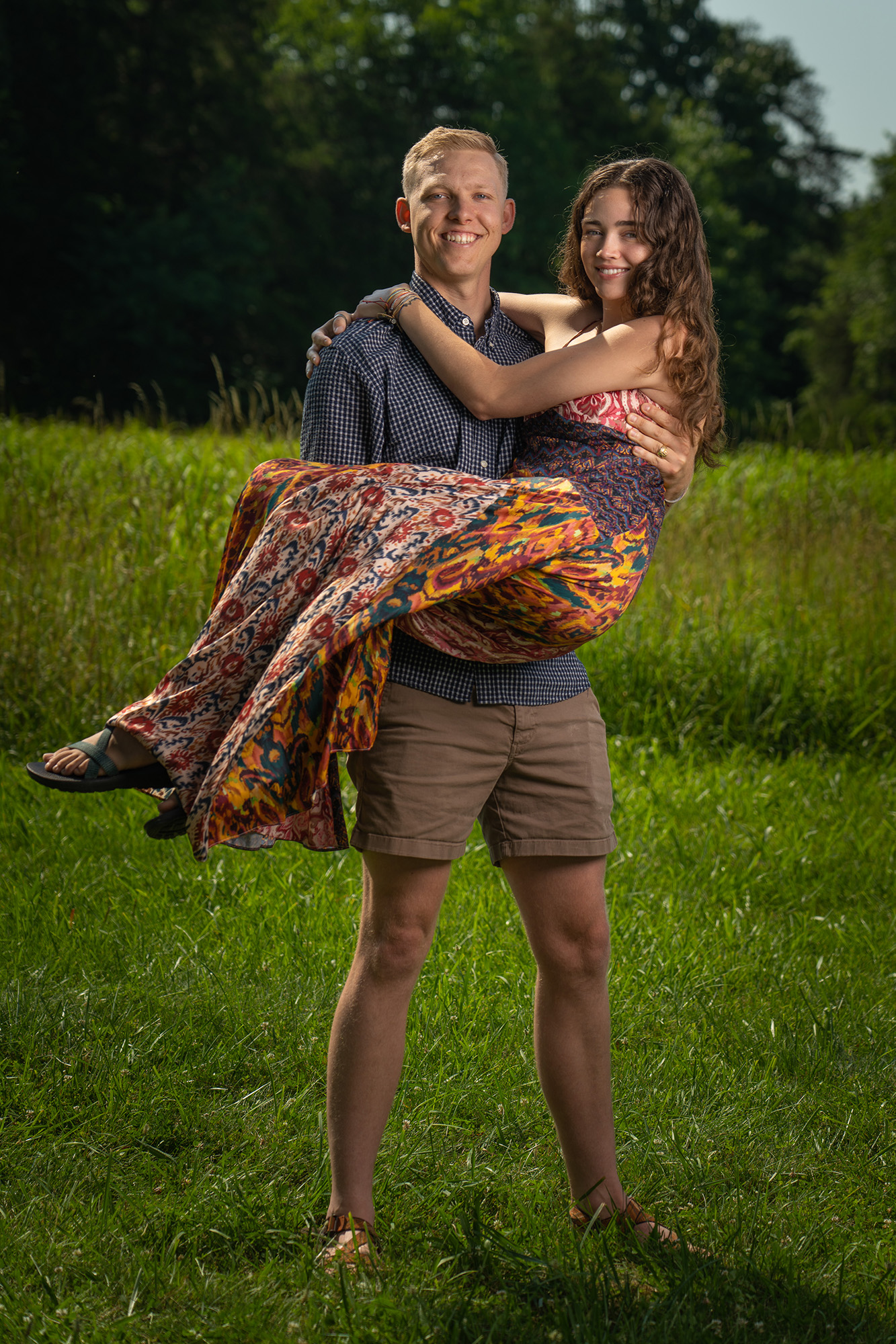 This is a couples portrait in summer at Manassas Battlefield, Virginia. One Profoto 500-watt strobe was used as key light and the sun was used as a backlight.